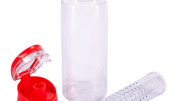 Lekki, szczelny bidon z solidnym zamknięciem, wyposażony w pojemnik na kawałki owoców lub miętę. Wykonany z tritanu - wytrzymałego, przezroczystego tworzywa niezmieniającego smaku napoju. Wolny od BPA.