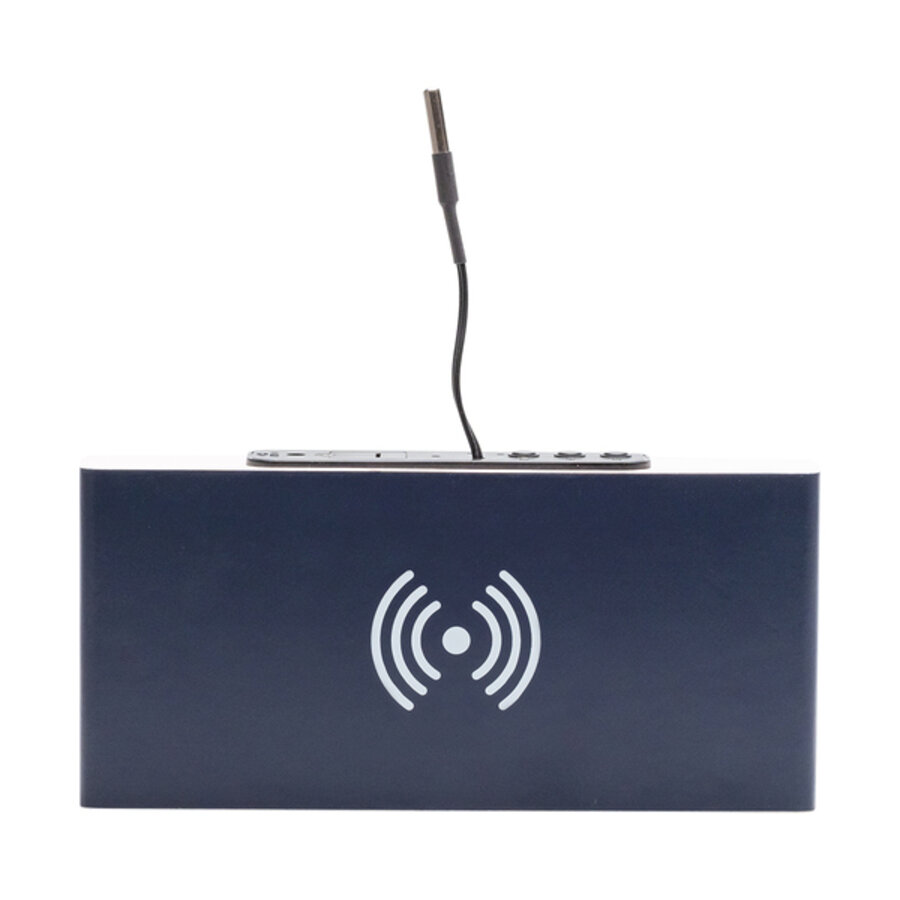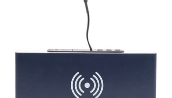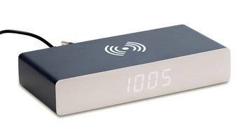 Biurkowa ładowarka indukcyjna z zegarem, wyświetla także datę i temperaturę. Zasilana przez kabelek USB oraz 2 bateriami typu LR1130. Funkcje urządzenia: naprzemienne wyświetlanie godziny, daty oraz temperatury. Możliwość regulacji poziomu jasności wyświetlacza, 3 alarmy. Ustawiony na tryb oszczędzania energii zegar jest uśpiony, a wyświetlacz nieaktywny. Wystarczy tylko klasnąć w dłonie lub dotknąć zegara, by wzbudzić wyświetlacz. Kabel i baterie dołączone w zestawie. Ładowarka działa z telefonami posiadającymi funkcję ładowania indukcyjnego. Moc: 5W.