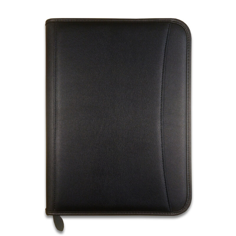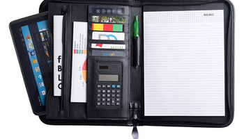 Wykonana z ekoskóry czarna teczka konferencyjna A4 z kalkulatorem, zapinana na zamek. Posiada aż 6 kieszonek, przegródki na dokumenty, uchwyt na długopis i kieszeń z zamkiem. Praktyczna teczka biznesowa wyposażona we wkład papierowy A4. Kalkulator zasilany 1 baterią AG10 dołączoną do produktu. Może pomieścić 20 wizytówek. Wyposażenie nie jest dołączone.